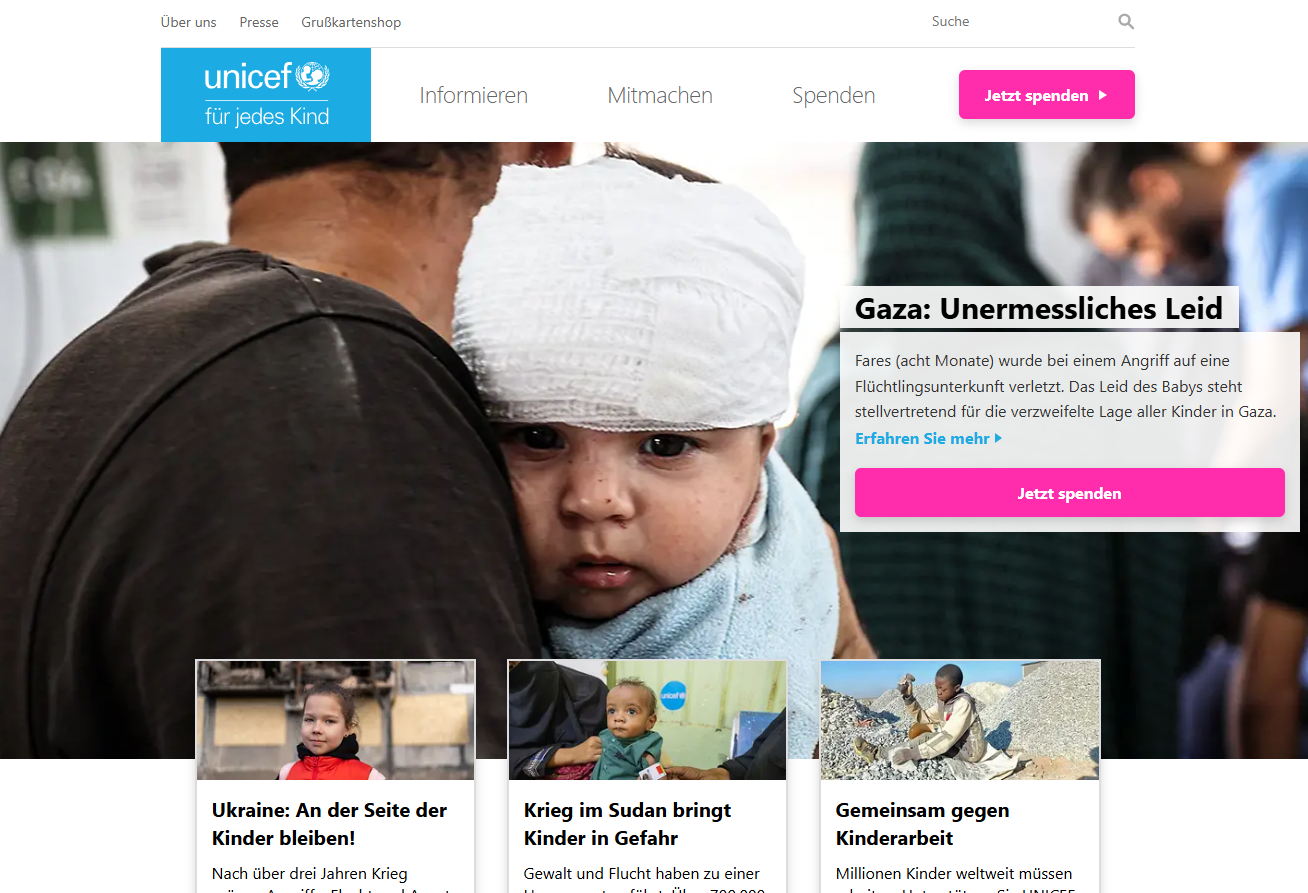 UNICEF Deutschland fokussiert sich auf weltweite Kinderhilfe. Die Website besticht durch emotionales Storytelling, transparente Spendenoptionen und eine klare Nutzerführung.