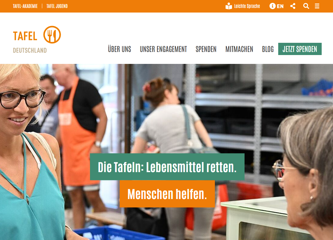 Die Tafel Deutschland e. V. unterstützt Bedürftige mit Lebensmitteln. Die Homepage bietet einen barrierearmen Zugang zu Informationen, vermittelt Wirkung und lädt zur aktiven Unterstützung ein – sowohl durch Geldspenden als auch durch ehrenamtliche Mitarbeit.